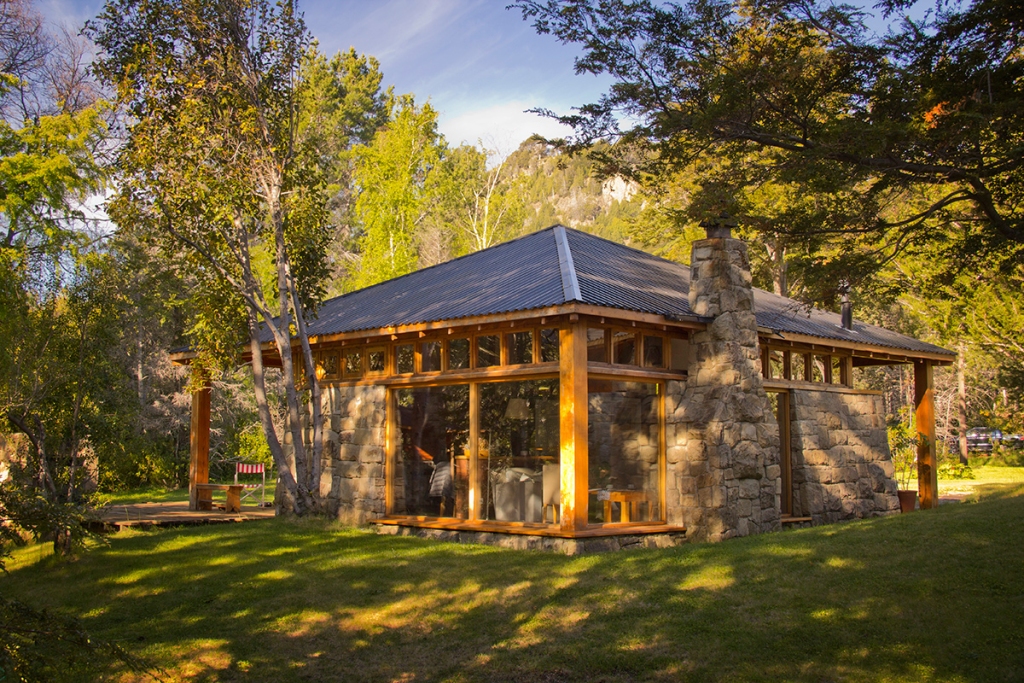 Las cabañas están construidas en madera nativa (ciprés, lenga) y piedra, generando una estética rústica sofisticada que se funde con el bosque virgen.